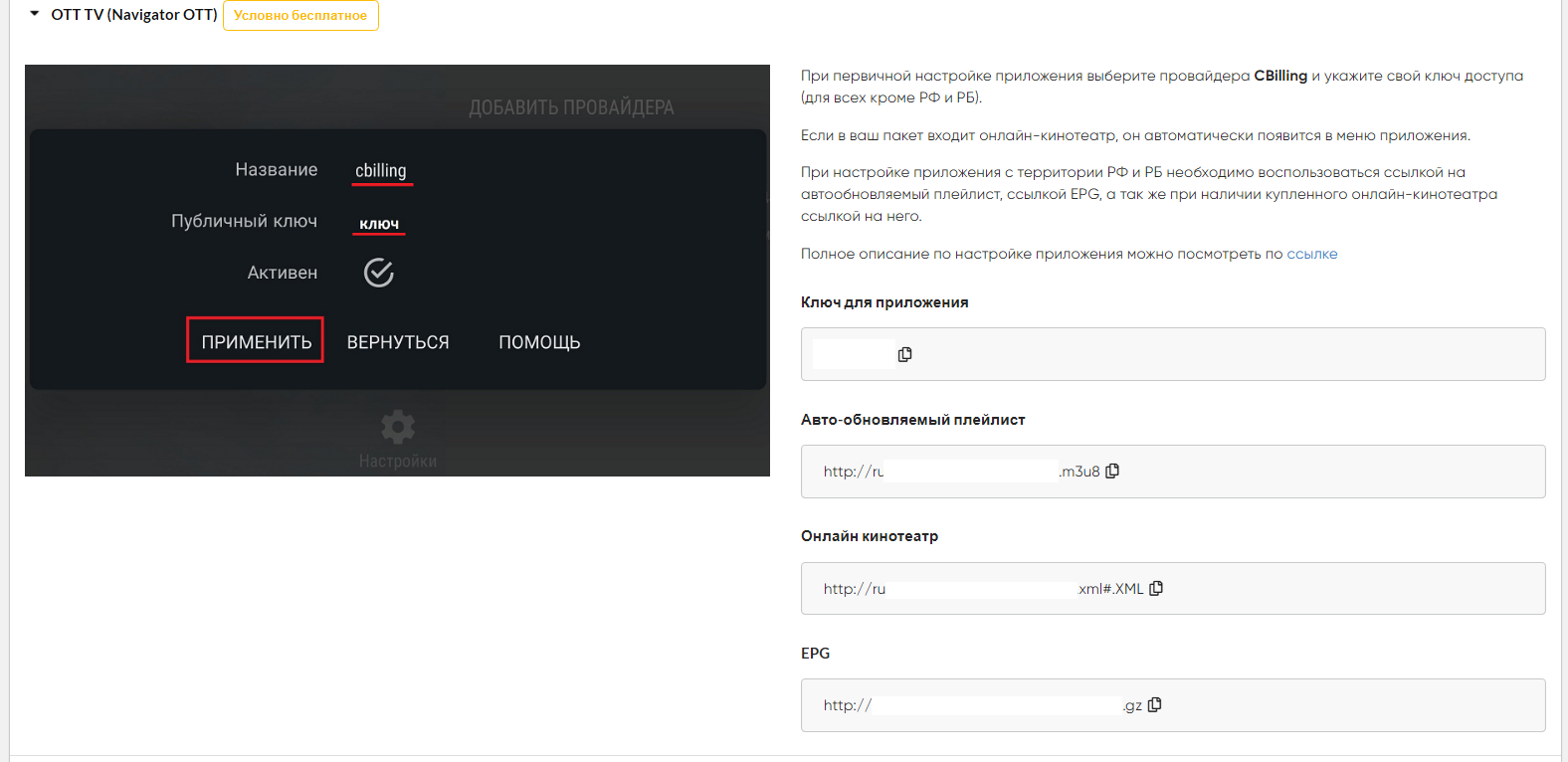 Важно! Для того, чтобы получить все необходимые настройки для приложения, нужно на главной странице вашего аккаунта на активном пакете выбрать опцию "Настройки", далее выбрать устройство- "Приставки", затем "Android Box" и выбрать настройки для приложения "OTT TV ( Navigator OTT)".