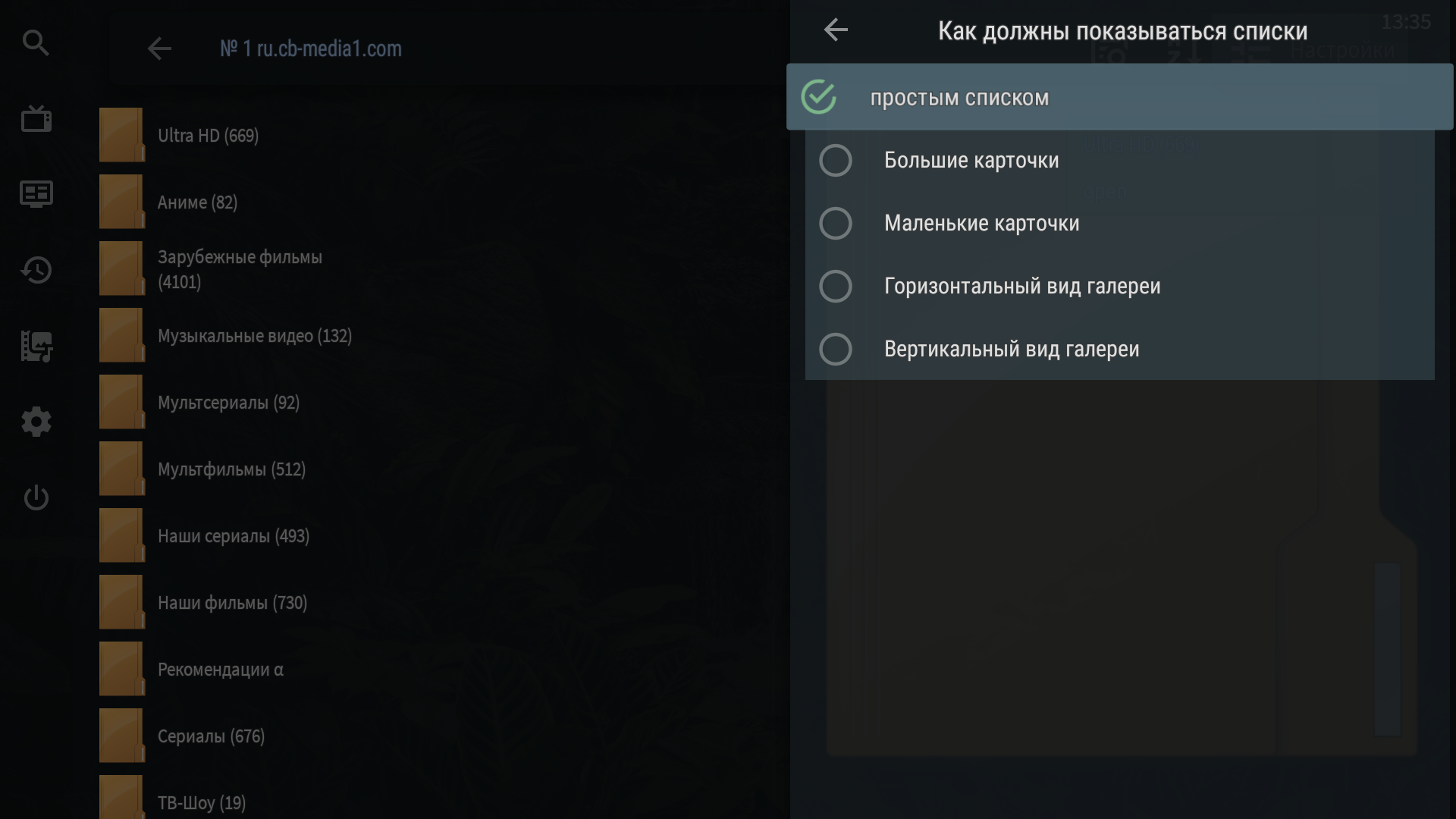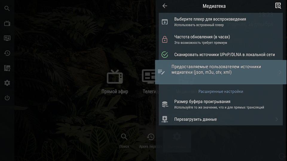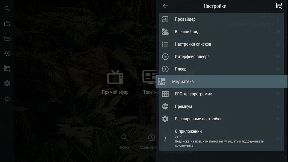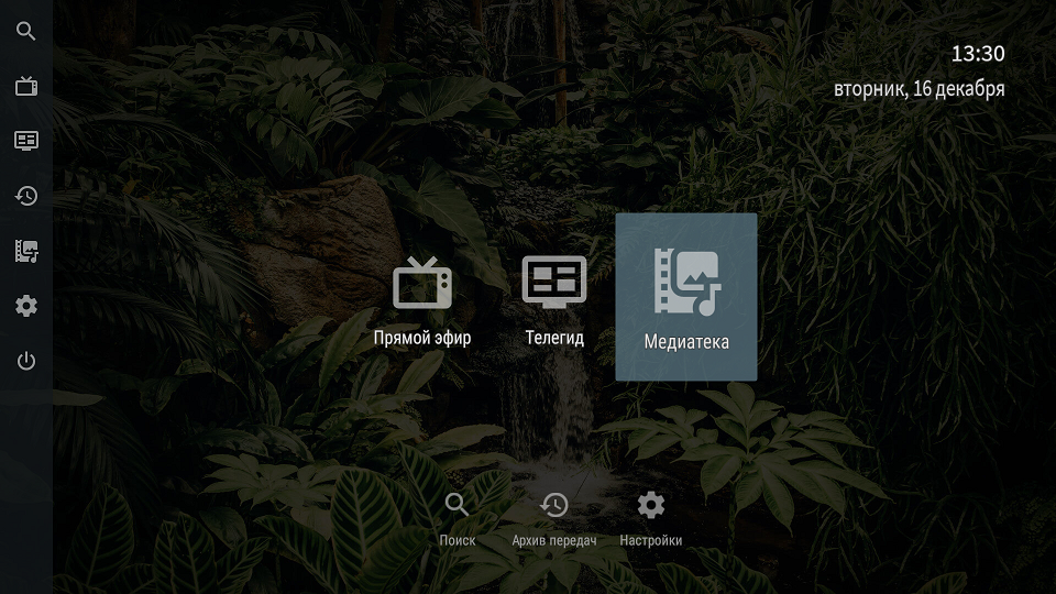 Все, на этом основные настройки закончены, несколько раз нажимаем назад и попадаем на главный экран приложения, в зависимости от активного пакета в меню может быть или не быть раздел Медиатека