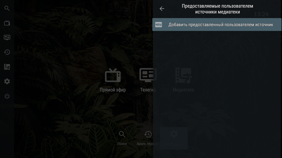 Открываем настройки приложения - Медиатека - Выбираем опцию- Предоставляемые пользователем источники медиатеки - Добавить предоставленный пользователем источник - Здесь нужно указать ссылку на медиатеку из настроек вашего пакета и применить настройки.