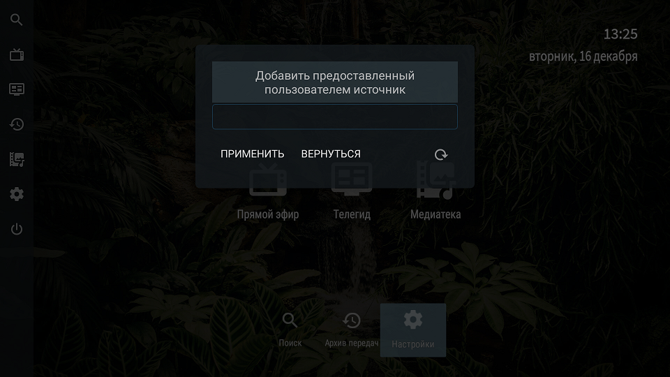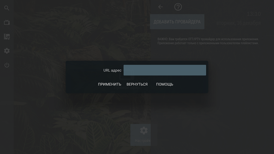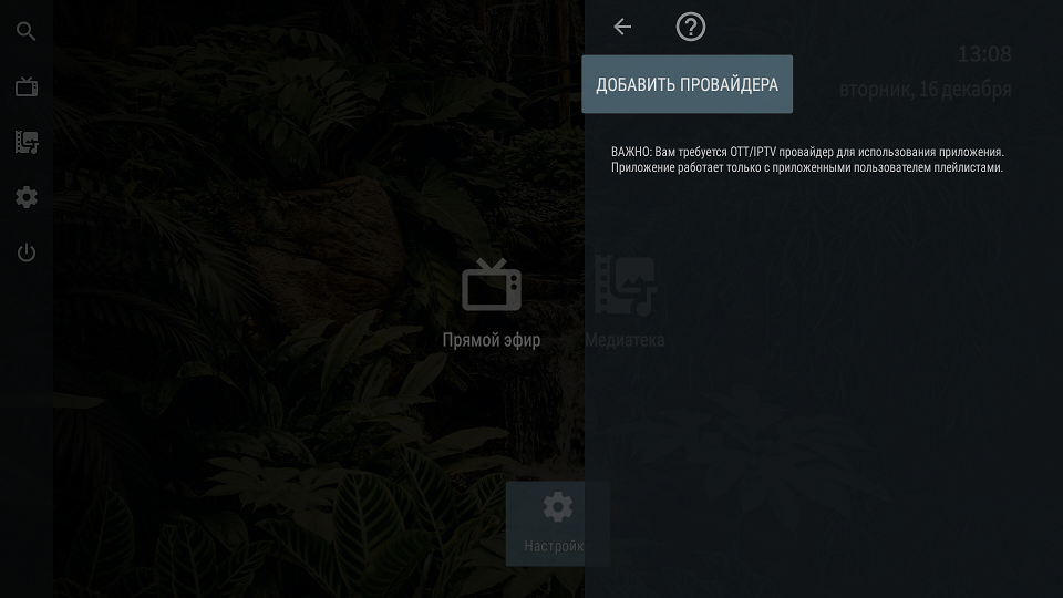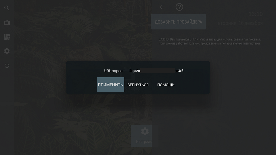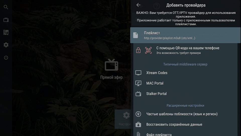Открываем настройки приложения- Провайдер- Добавить провайдера - Выбираем опцию - Плейлист
