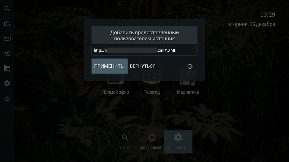 Здесь в настройках нужно указать: URL адрес - нужно внимательно указать ссылку на авто-обновляемый плейлист из настроек вашего пакета; После редактирования применить настройки